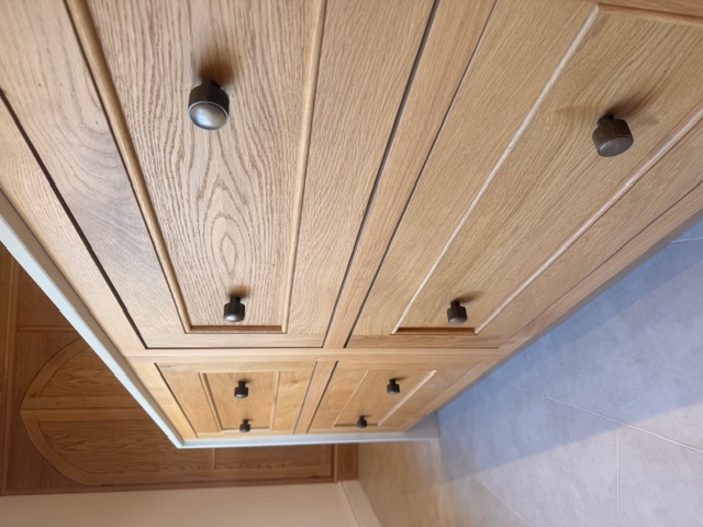Our in frame design here sees a plain, strong frame that supports the country style characterful doors. We wanted a frame that when paired with a bold bead in the shaker door, would support it, rather than distract it. This is more of a traditional, rustic kitchen door design, but with a slimmer shaker, gives it slightly modern and handsome touch. I absolutely love this collection in oak, especially to see all the knots and the grain which reminds me of my sons growing character. If you are looking for a feature island in your country kitchen, this would be a strong choice!